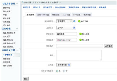 模型可綁定欄目,新建欄目時選擇模型類型, 這樣在當前欄目下添加內容時將繼承模型的定義。并自動加載被選模型的模版設置。如下圖所示: