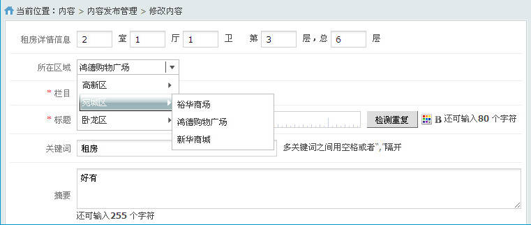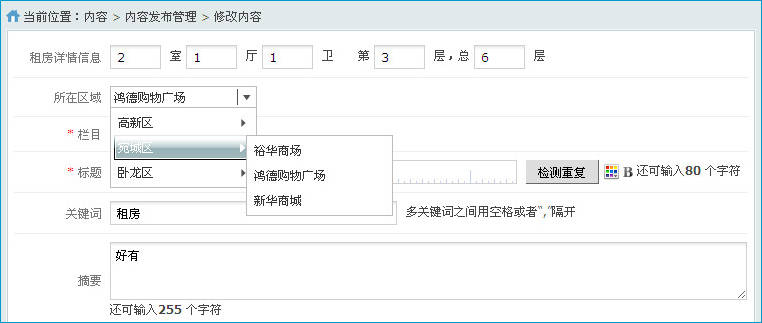 添加完成以后,在模型應用欄目,添加信息時,就會出現聯(lián)動菜單選擇框,效果如下圖所示: