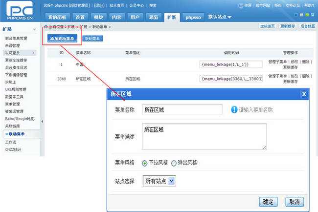 下面我們以為租房模型添加一個所在區(qū)域聯(lián)動菜單為例,說明聯(lián)動字段的使用, 首先添加聯(lián)動菜單數據,并選擇菜單風格和應用站點范圍(V9 支持多站點站群系統(tǒng)),如下圖所示: