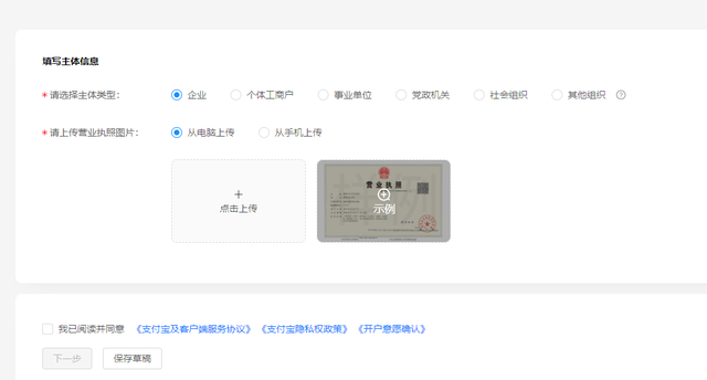上傳主體證照、填寫主體信息,根據(jù)商戶主體類型(普通企業(yè)、個體工商戶、黨政機關、事業(yè)單位、社會組織、其他組織)完善主體信息。